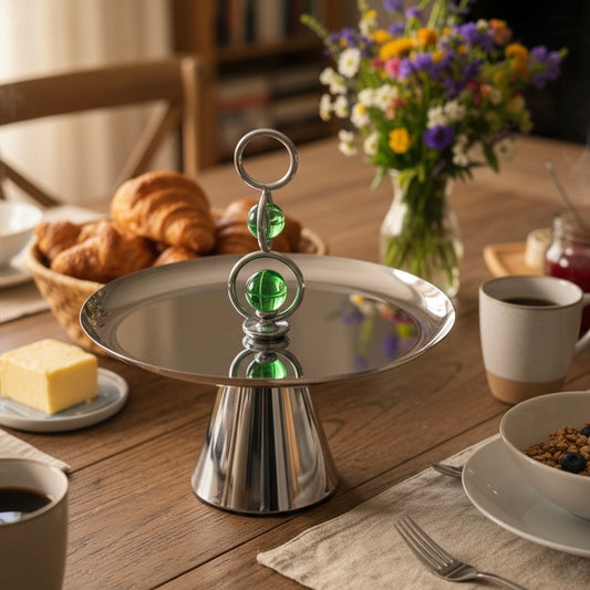 Mawaeen Metal Cake Stand with Cover & Green Crystal Accent – Silver