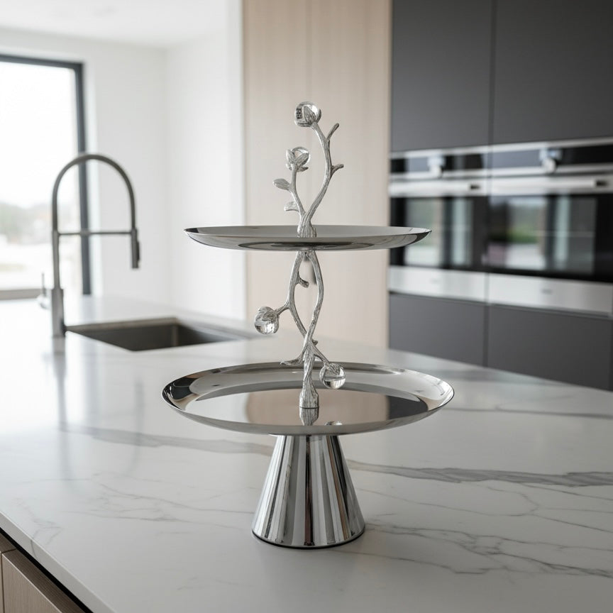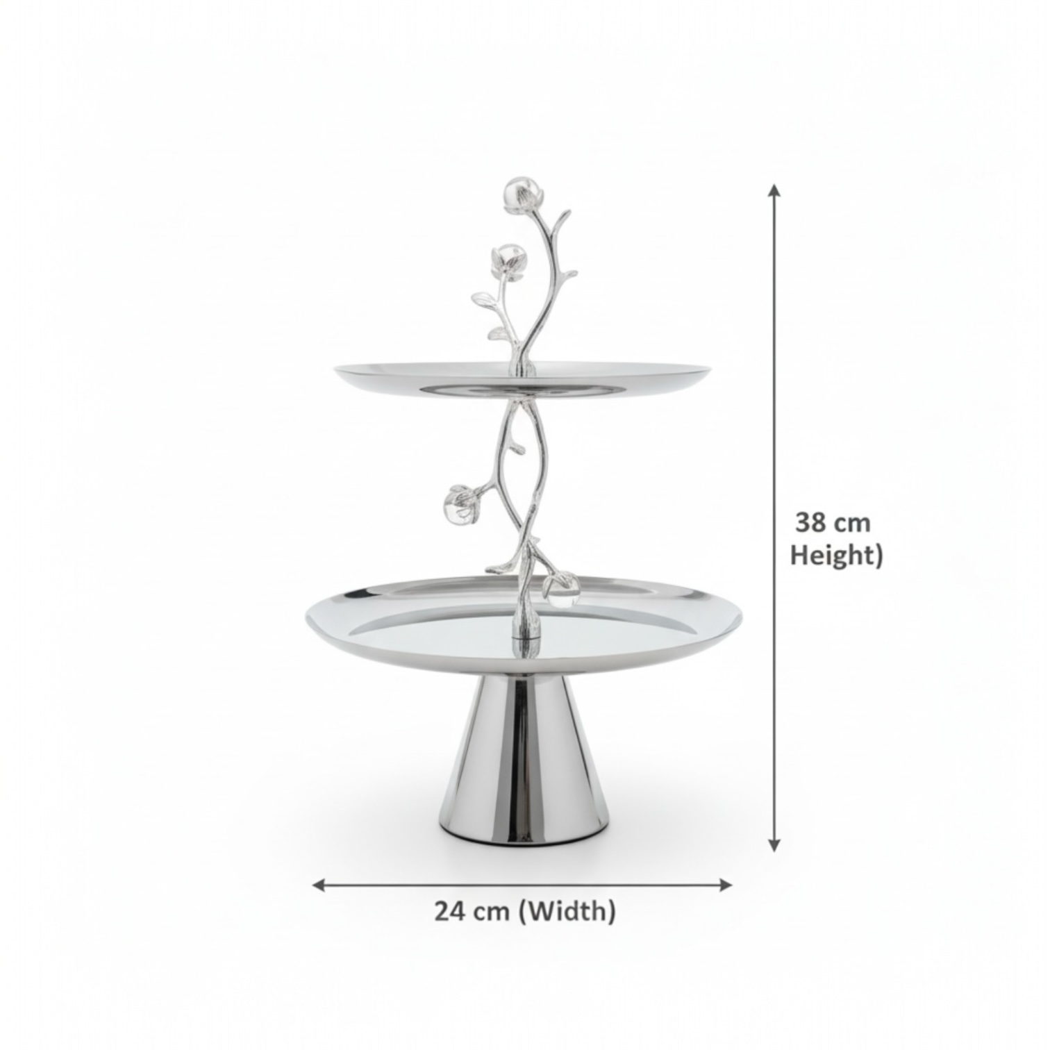 Crafted from premium stainless steel, this piece showcases a stunning floral-inspired design, with delicate branches and blooming flowers gracefully connecting the two tiers.