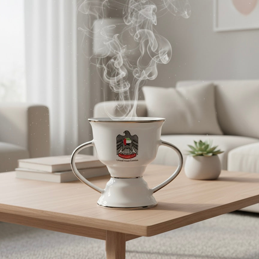 A statement of elegance and national pride, this large incense burner features the UAE emblem on a sleek white ceramic body with refined silver accents. Designed with graceful handles and a wide top for smooth smoke flow, it adds a distinguished touch to spacious living rooms, majlis, or offices.