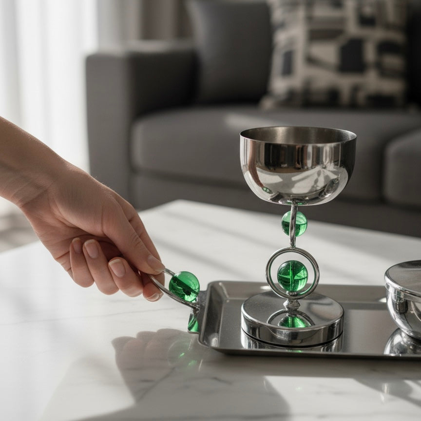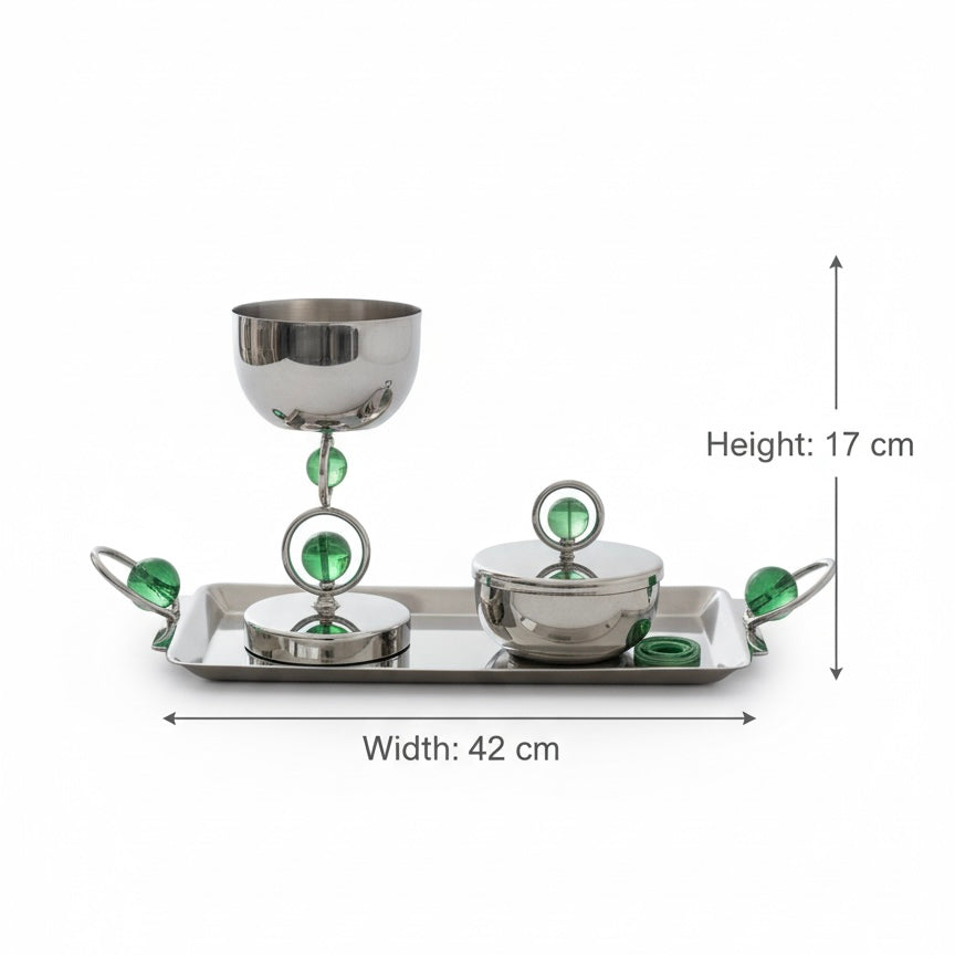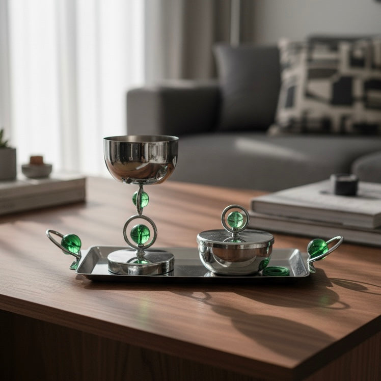 A refined incense burner set presented in an elegant wooden box lined with soft satin. The set includes a metal incense burner with a Green Crystal Details, a bakhoor storage jar with a matching lid, and a stylish serving tray. Designed to elevate your home ambiance with a warm, luxurious fragrance. Perfect as a sophisticated gift or for enhancing your own living space.