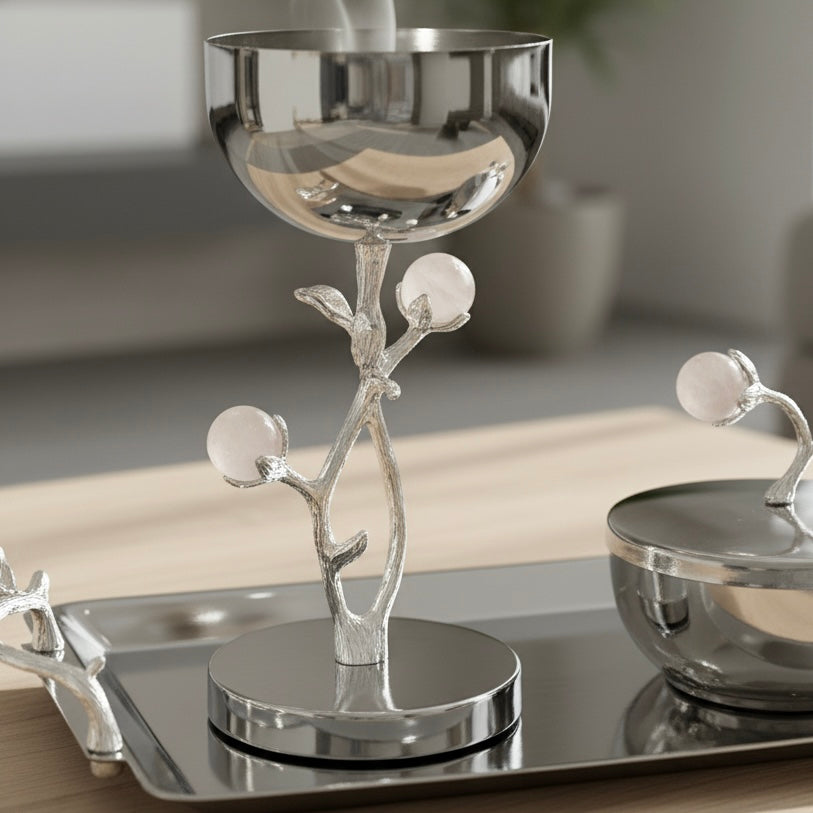 Experience the elegance of this refined incense burner set, presented in a sleek design that captures modern sophistication. The set features a striking metal incense burner with a contemporary stand, creating an artistic focal point in your space. Accompanied by a matching bakhoor storage jar, this set is both functional and decorative.