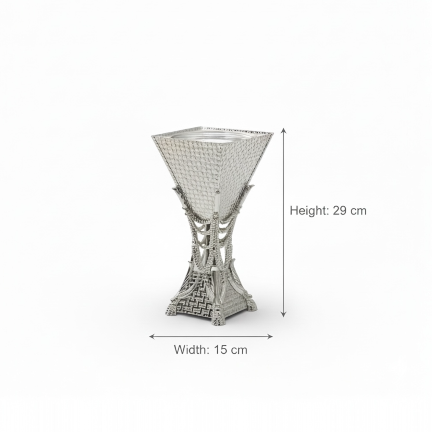 This large full-silver incense burner is a masterpiece of refined craftsmanship and modern elegance. Designed with a bold inverted pyramid shape and intricate metallic texture, it exudes a luxurious aura that complements any sophisticated interior. The elevated base adds stability and grandeur, allowing the incense smoke to rise gracefully and fill the room with a calming, aromatic presence.