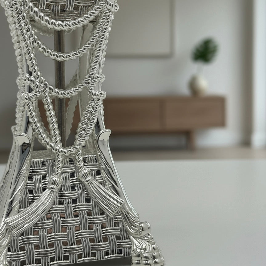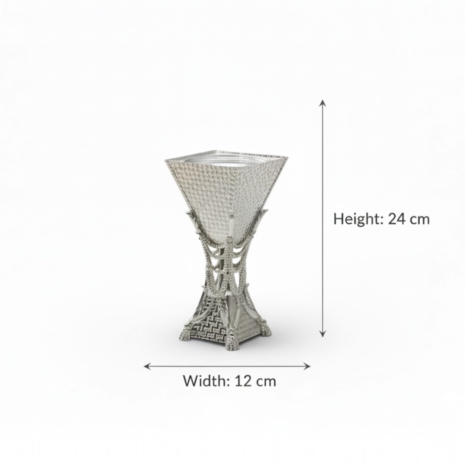 This medium-sized incense burner showcases a sleek silver finish with detailed engravings that reflect understated sophistication. Its balanced proportions and clean design make it an ideal choice for everyday use or as a stylish accent piece.