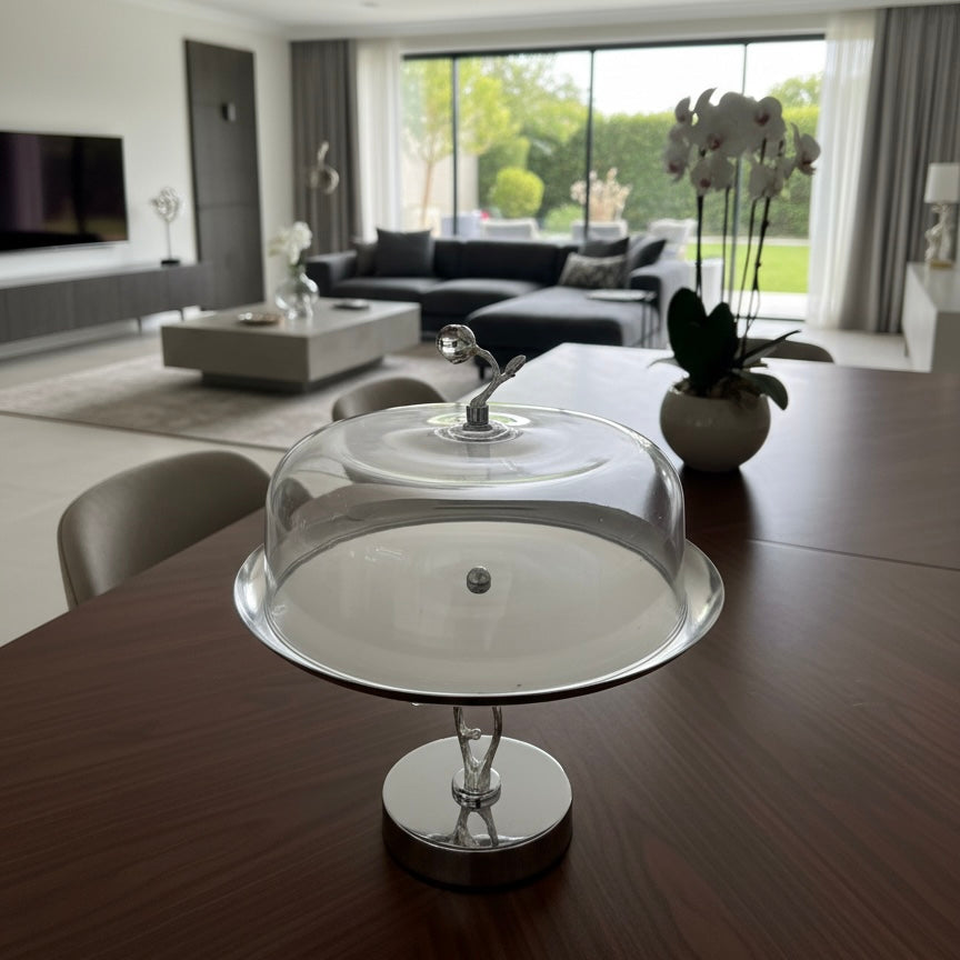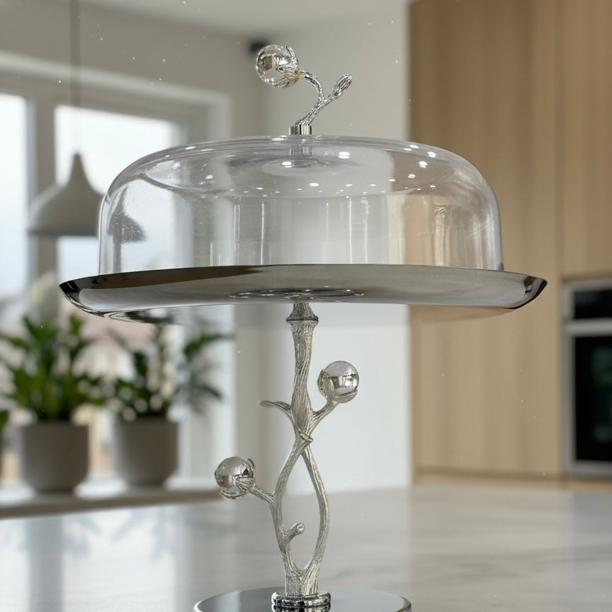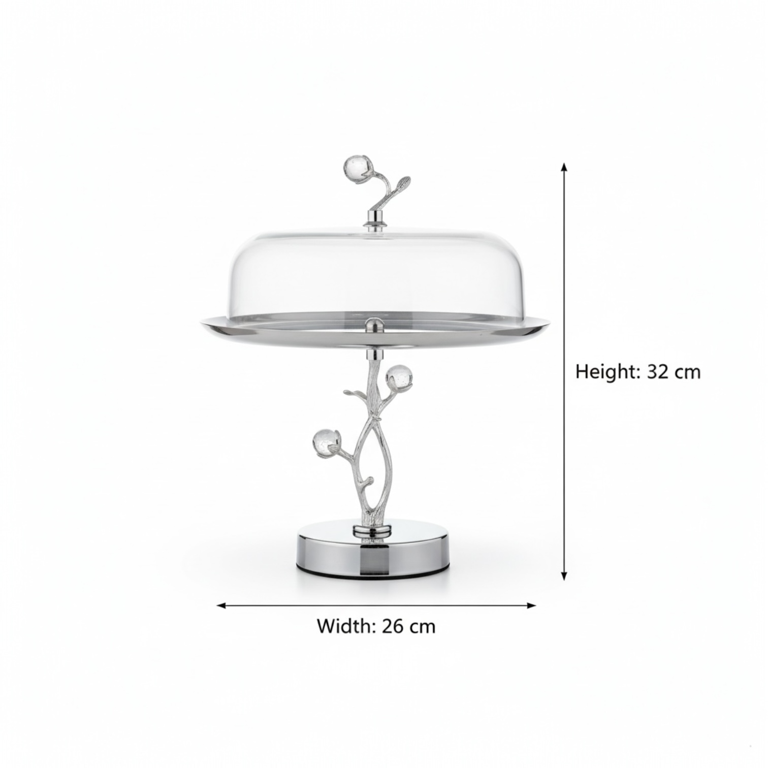 The clear, dome-shaped lid preserves the freshness of your sweets while showcasing them beautifully, and the sturdy silver base ensures stability and balance.