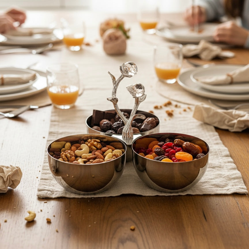 Beautifully crafted from high-quality stainless steel, it features three small bowls ideal for serving nuts, candies, or dried fruits in style.
