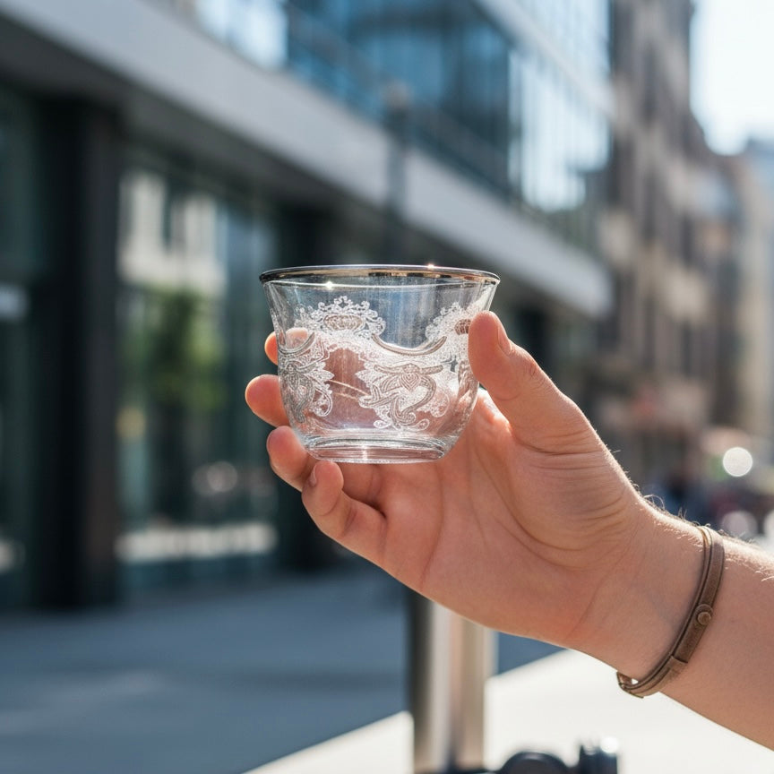Each cup is made in Turkey from premium glass, featuring a beautifully hand-drawn ornamental design inspired by classical Ottoman and Arabic motifs.