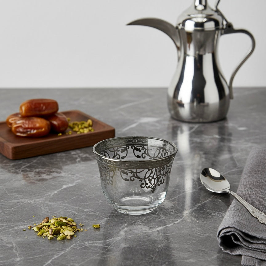 Each cup is made in Turkey from premium glass, featuring a beautifully hand-drawn ornamental design inspired by classical Ottoman and Arabic motifs.
