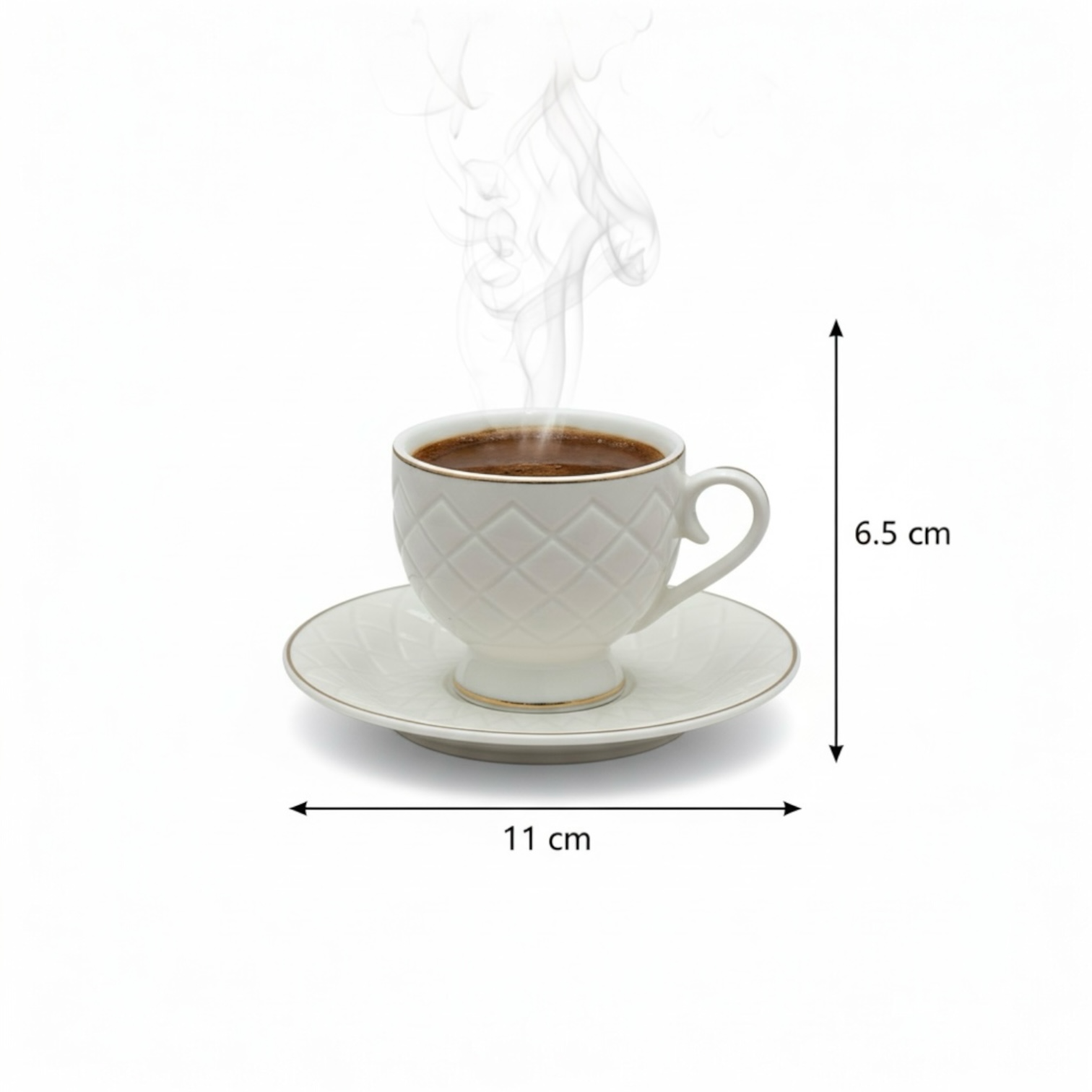 The set includes six cups with matching saucers, creating a coordinated and graceful presentation that embodies true hospitality and luxury.