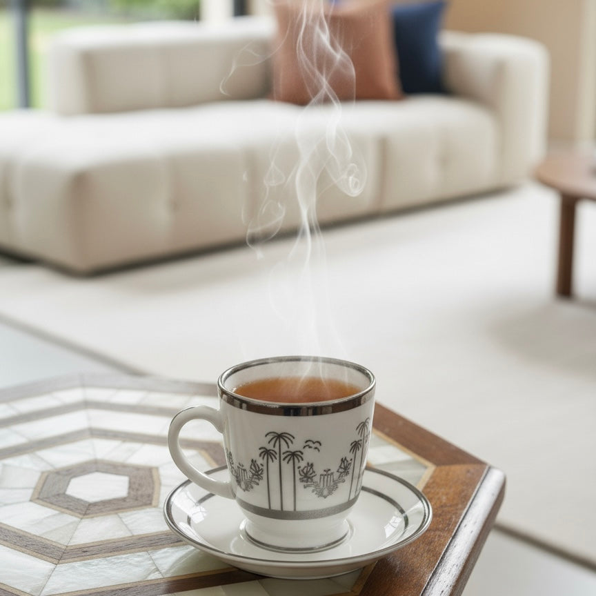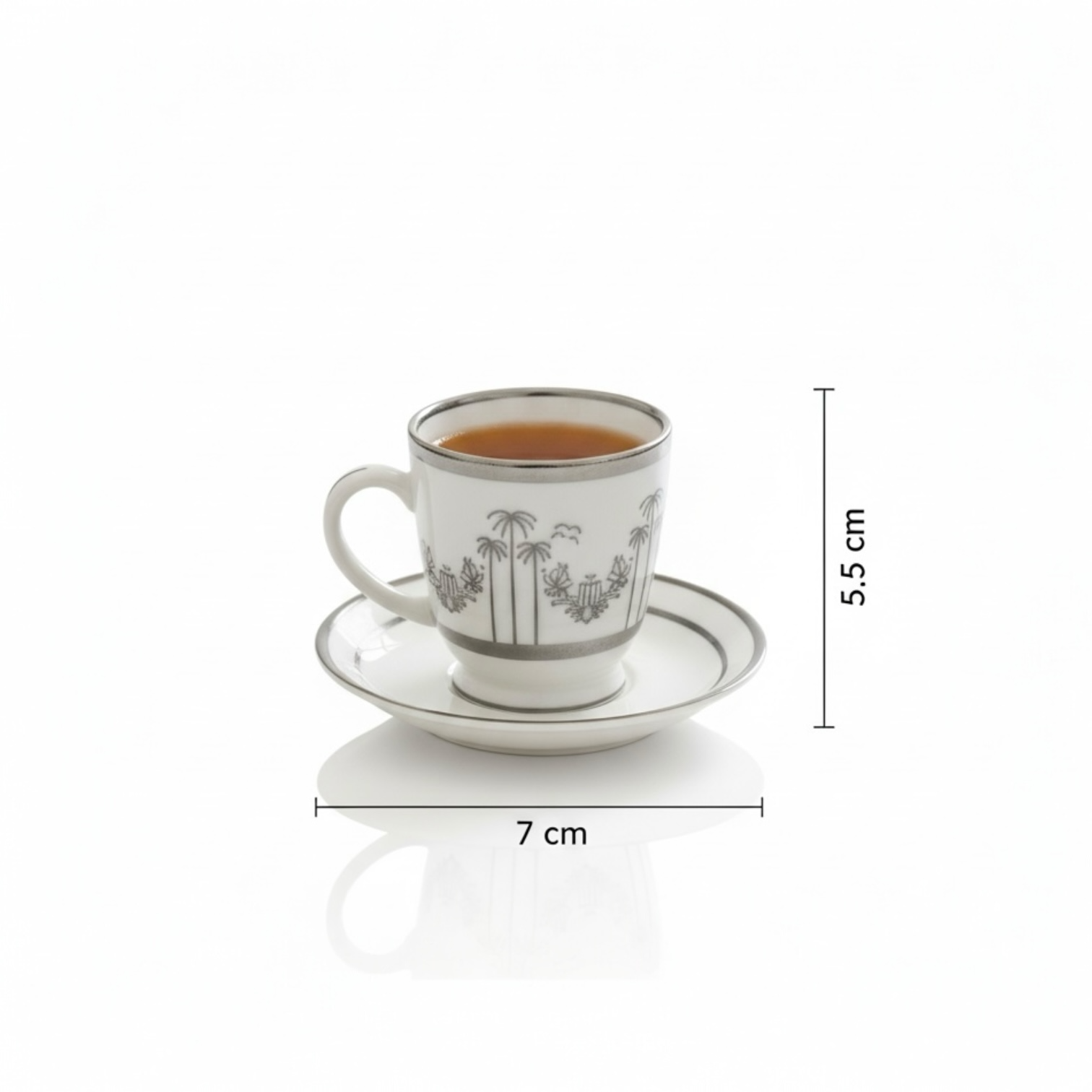 Made from premium porcelain, each cup showcases an elegant palm and wreath motif with fine metallic detailing that reflects the beauty of Arabian artistry.
