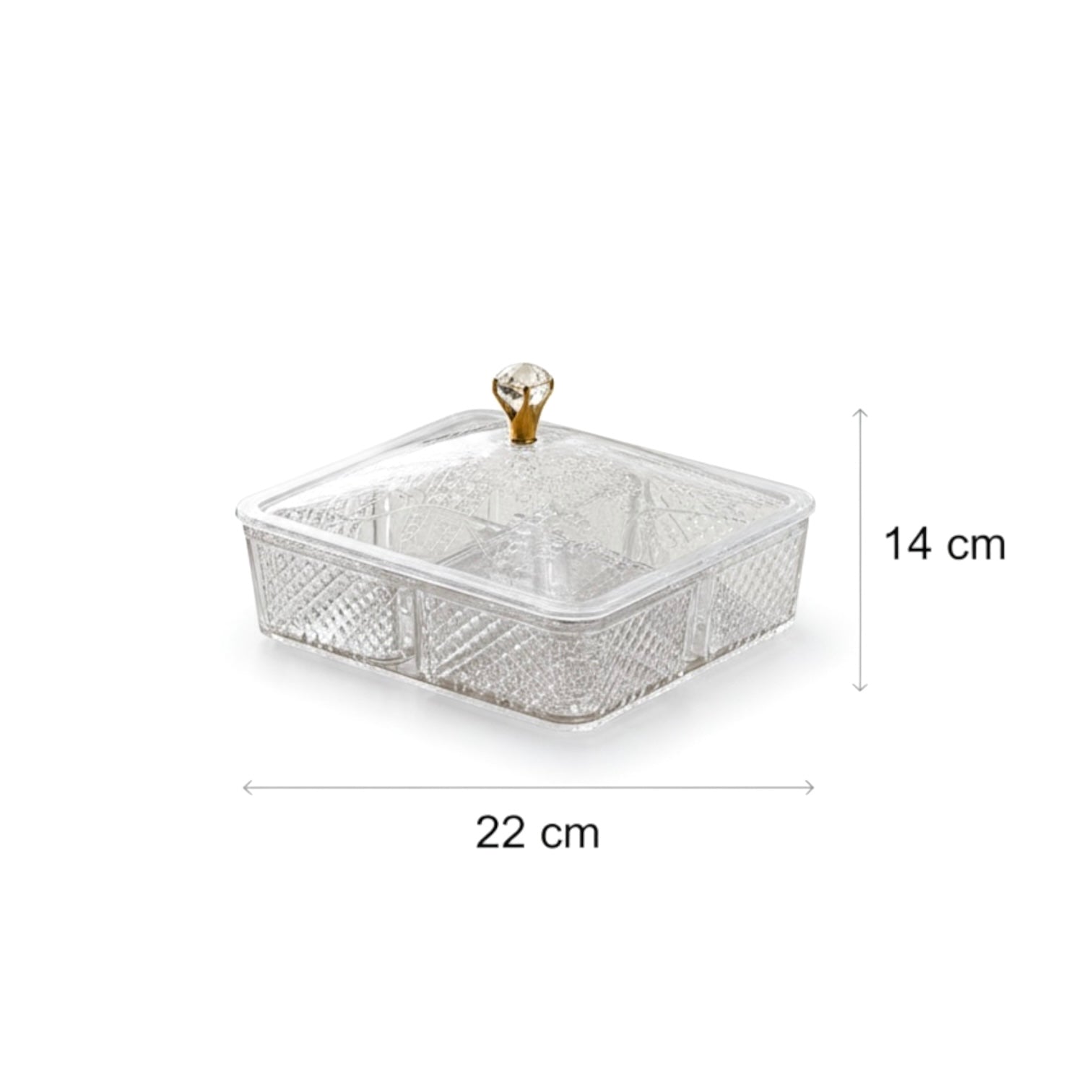 This beautifully crafted acrylic candy box adds a touch of refinement to any serving table. Designed in a modern square shape, it features four spacious compartments, allowing you to neatly organize and present nuts, chocolates, dried fruits, or assorted sweets in an elegant and practical way.