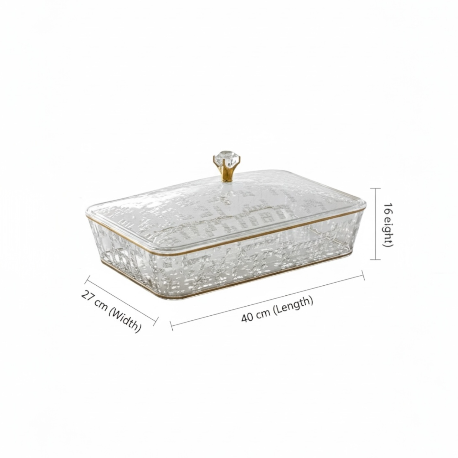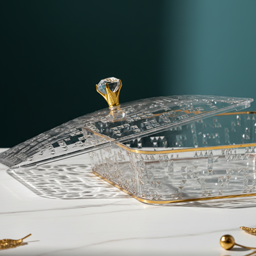 The elongated rectangular shape provides generous space for presenting nuts, dates, chocolates, dried fruits, or assorted sweets, making it ideal for guests, family gatherings, and special occasions. The matching lid, crafted with the same sleek texture, is topped with a crystal-style knob for effortless handling and an added touch of sophistication.