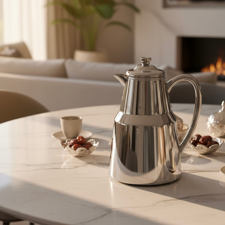 With its sleek silver design and high-quality build, it’s perfect for serving Arabic coffee or tea in a refined way, whether at home, in the office, or on the go.