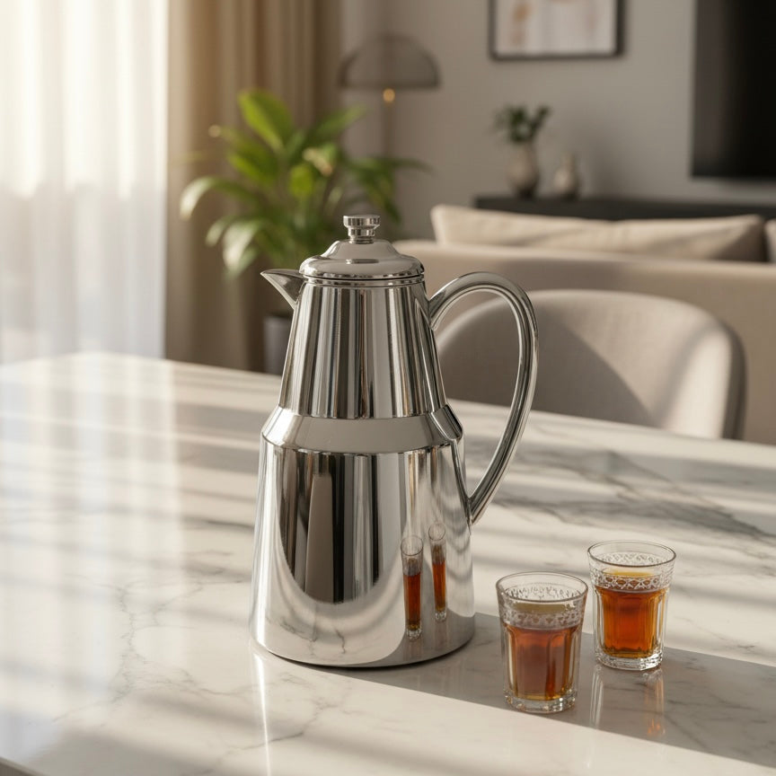 With its sleek silver design and high-quality build, it’s perfect for serving Arabic coffee or tea in a refined way, whether at home, in the office, or on the go.