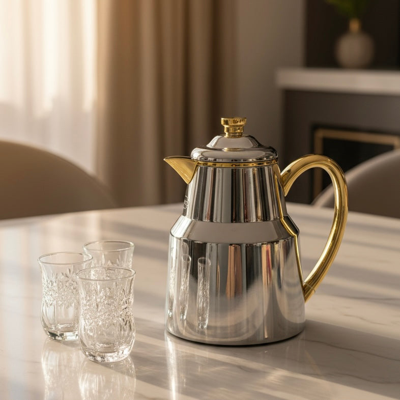 With its sleek silver design and high-quality build, it’s perfect for serving Arabic coffee or tea in a refined way, whether at home, in the office, or on the go.