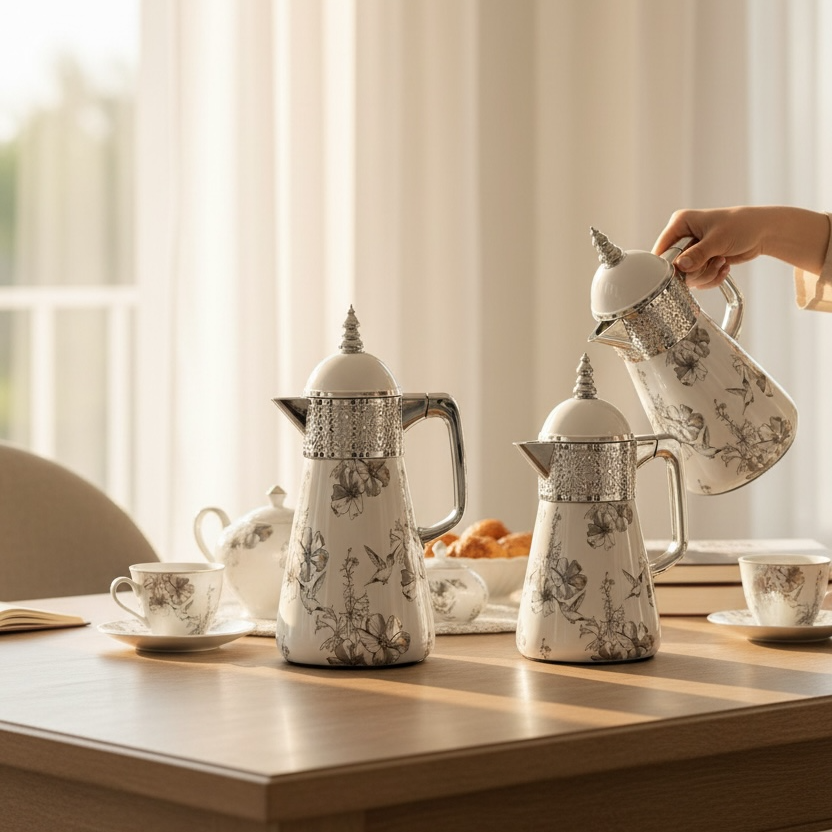 Made to keep your beverages hot for extended periods, this set is ideal for serving Arabic coffee, tea, or herbal drinks during gatherings, family events, or daily use.