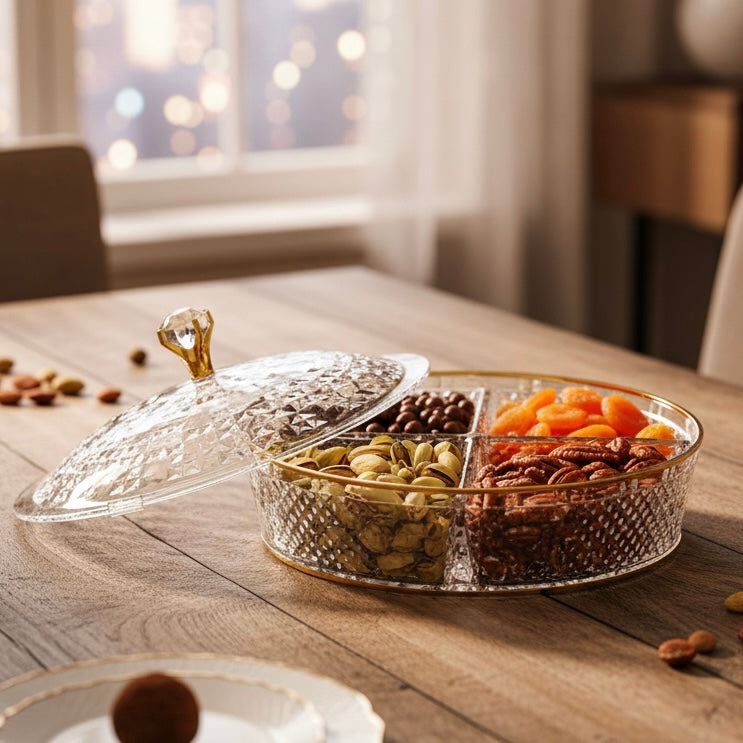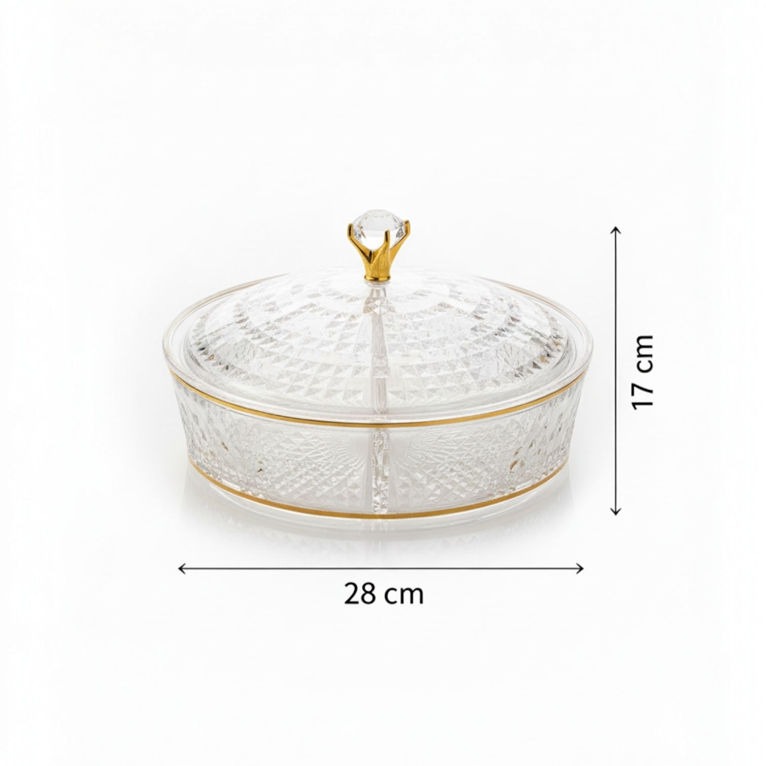 The spacious circular shape provides ample room for serving nuts, chocolates, dates, sweets, or dried fruits, making it ideal for gatherings, special occasions, or daily hospitality. The matching lid is topped with a crystal-style decorative knob, adding a luxurious touch while ensuring easy lifting.