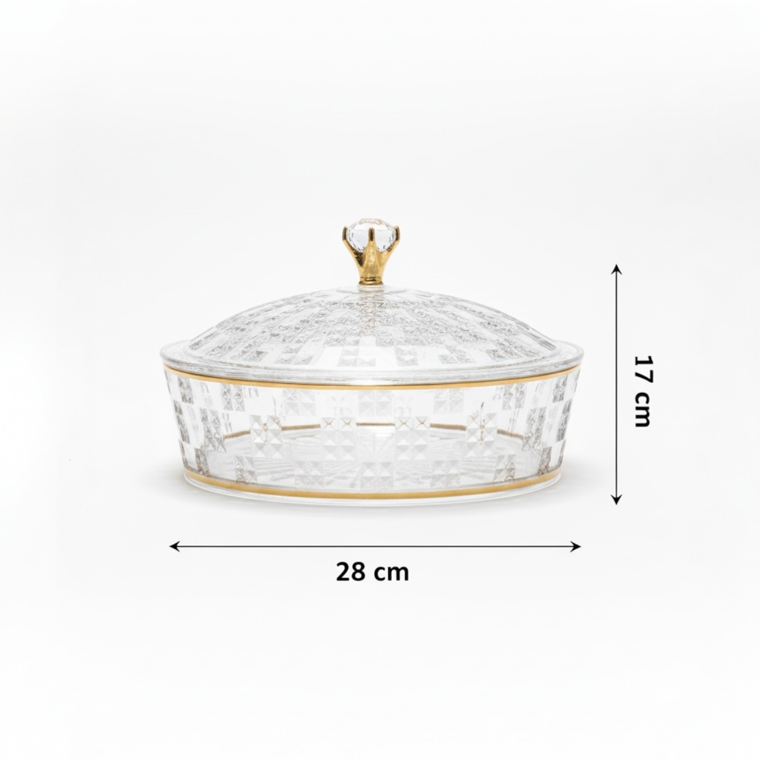 The spacious circular shape provides ample room for serving nuts, chocolates, dates, sweets, or dried fruits, making it ideal for gatherings, special occasions, or daily hospitality. The matching lid is topped with a crystal-style decorative knob, adding a luxurious touch while ensuring easy lifting.