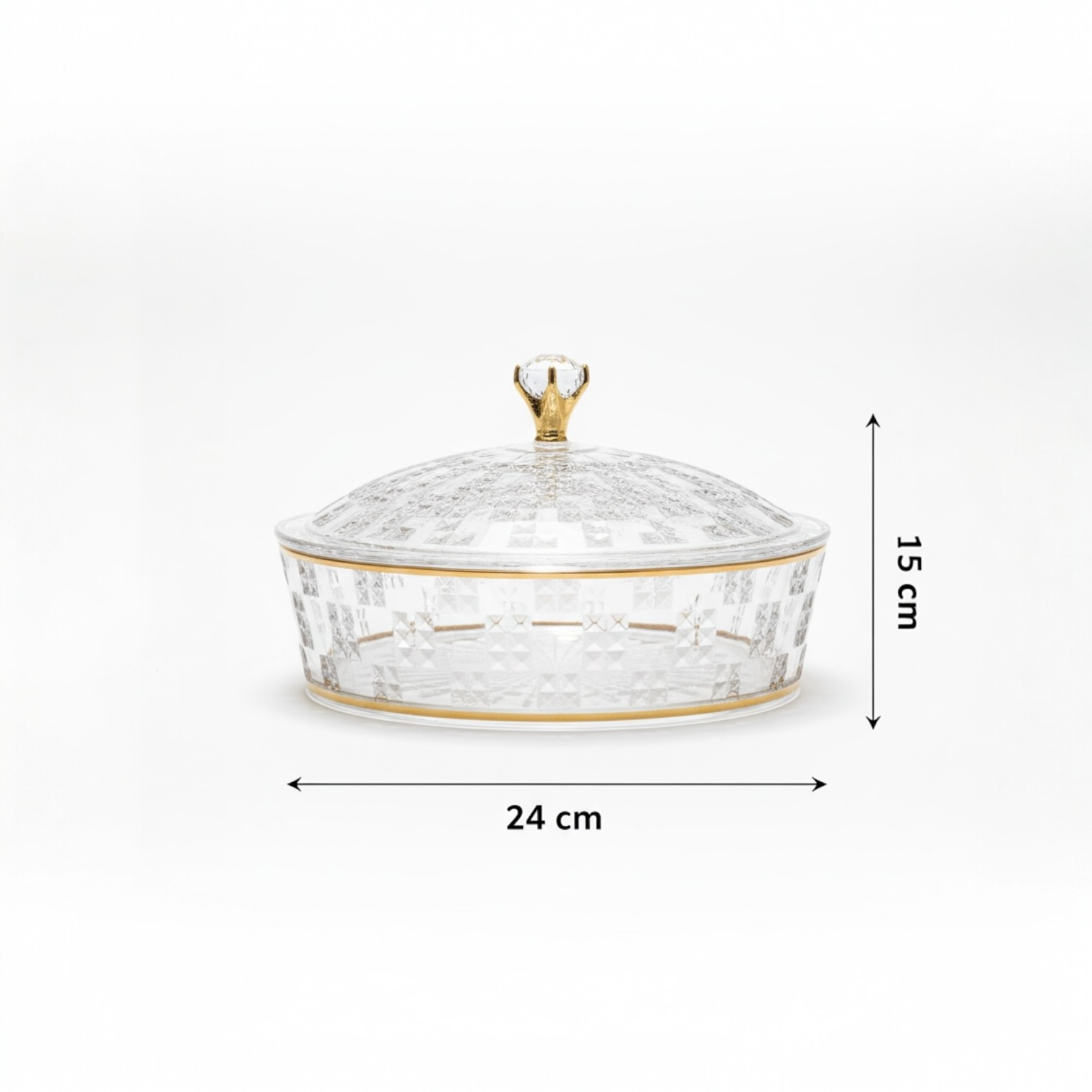 The spacious circular shape provides ample room for serving nuts, chocolates, dates, sweets, or dried fruits, making it ideal for gatherings, special occasions, or daily hospitality. The matching lid is topped with a crystal-style decorative knob, adding a luxurious touch while ensuring easy lifting.