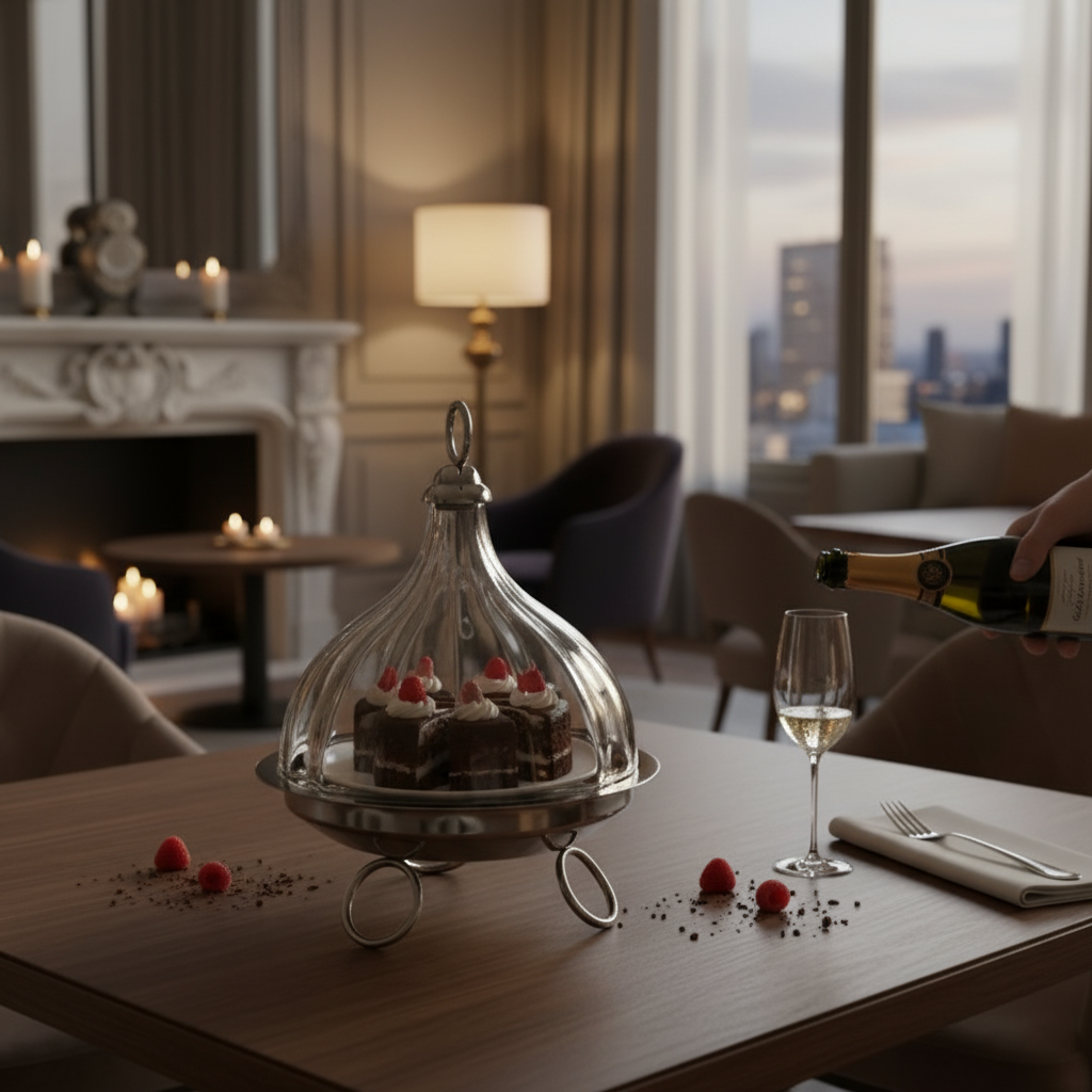 The polished silver-toned base provides stability and luxury, while the clear, textured glass dome acts as a fog-free display cover, preserving the freshness of individual cakes and pastries while highlighting their beauty with a modern-classic touch. This is not just a serving plate; it's a décor piece that adds warmth and sophistication to any tea table or hospitality corner.